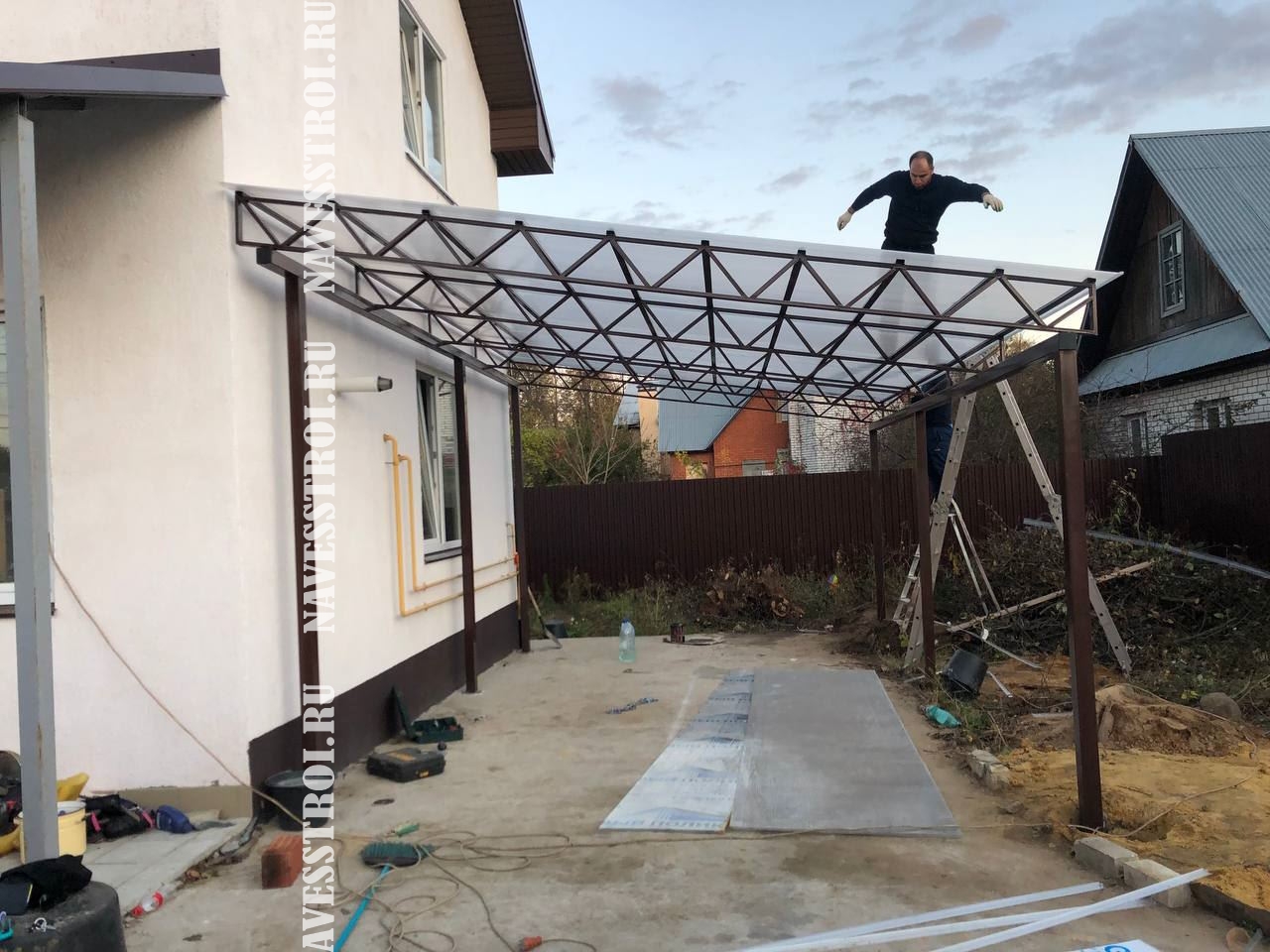 За день на даче изготовили арочный навес 5 на 7 с покрытием поликарбоната. Привезли уже готовые крашенные фермы и весь остальной материал. Все за собой убрали и увезли мусор. Молодцы!